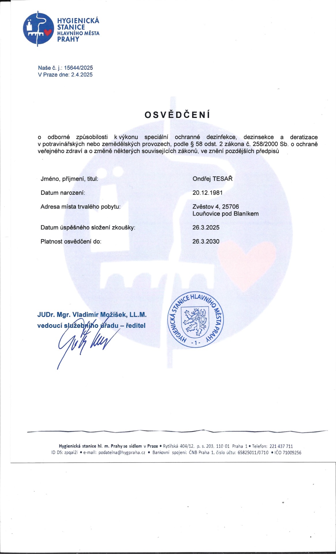 1. Speciální ochranná dezinfekce, dezinsekce a deratizace bez použití nebezpečných chemických látek nebo chemických směsí klasifikovaných jako toxické nebo vysoce toxické, s výjimkou speciální ochranné dezinfekce, dezinsekce a deratizace v potravinářských a zemědělských provozech.